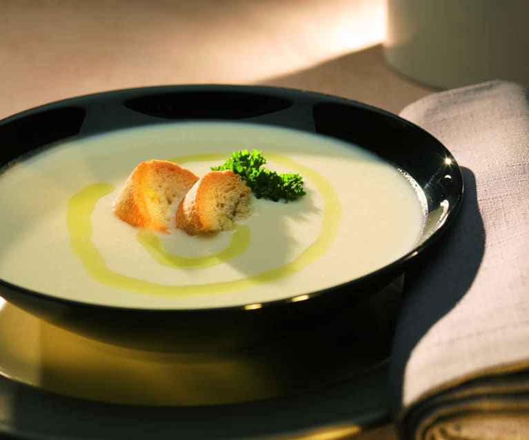 Ponga en el vaso el puerro y trocee 4 seg/vel 5. Con la espátula, baje el puerro hacia el fondo del vaso. Incorpore la mantequilla y rehogue 8 min/100°C/vel 2. Añada la coliflor, las patatas y la leche y programe 30 min/90°C/vel 2. Espere unos minutos a que baje un poco la temperatura y triture 2 min/vel 5 -10 progresivamente. Añada la nata, la sal, la pimienta y la nuez moscada. Programe 2 min/100°C/vel 3. Espolvoree con el perejil picado y sirva caliente o fría. Puede acompañar de costrones de pan frito y un chorrito de aceite de oliva virgen extra.