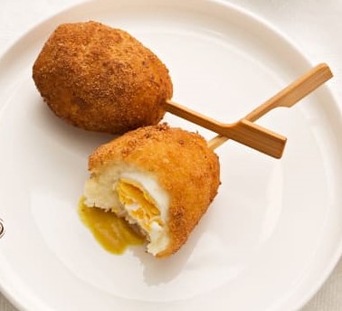 Sumerja los palos de brocheta en un recipiente con agua durante 10 minutos. Reboce cada huevo cubierto con bechamel en pan rallado y, con la mano, deles forma de huevo. Báñelos en huevo batido, rebócelos de nuevo en el pan rallado y pinche cada uno en un palo de brocheta. Fríalos en un cazo pequeño con abundante aceite caliente y deje escurrir sobre papel de cocina. Sirva inmediatamente.