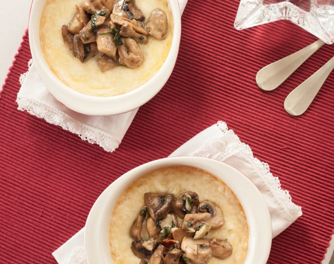 Retire el queso del horno, vierta encima los champiñones y sirva inmediatamente.