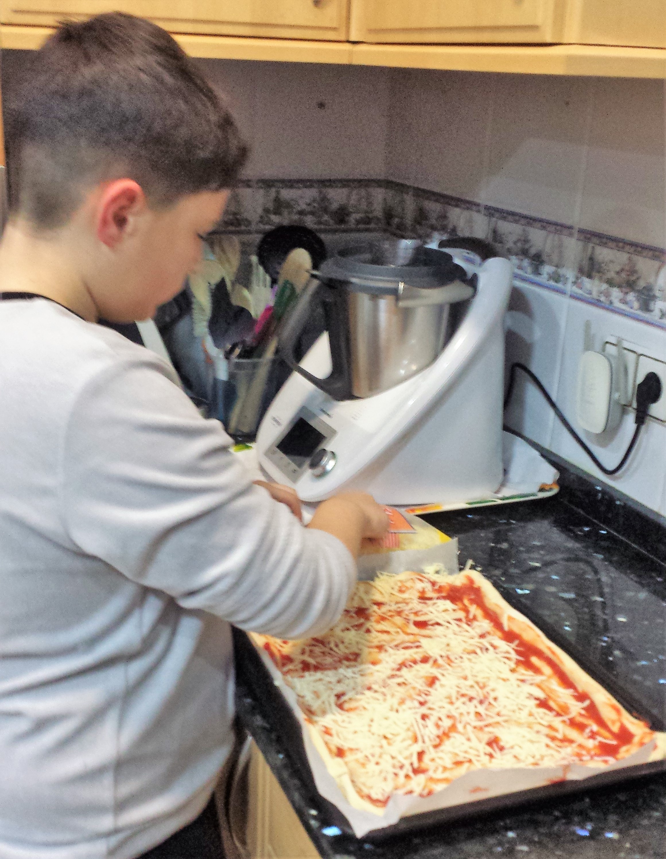 Yo he tenido un buen ayudante, a el le encanta improvisar y ponerle los ingredientes que mas le gustan, sobre todo el queso.