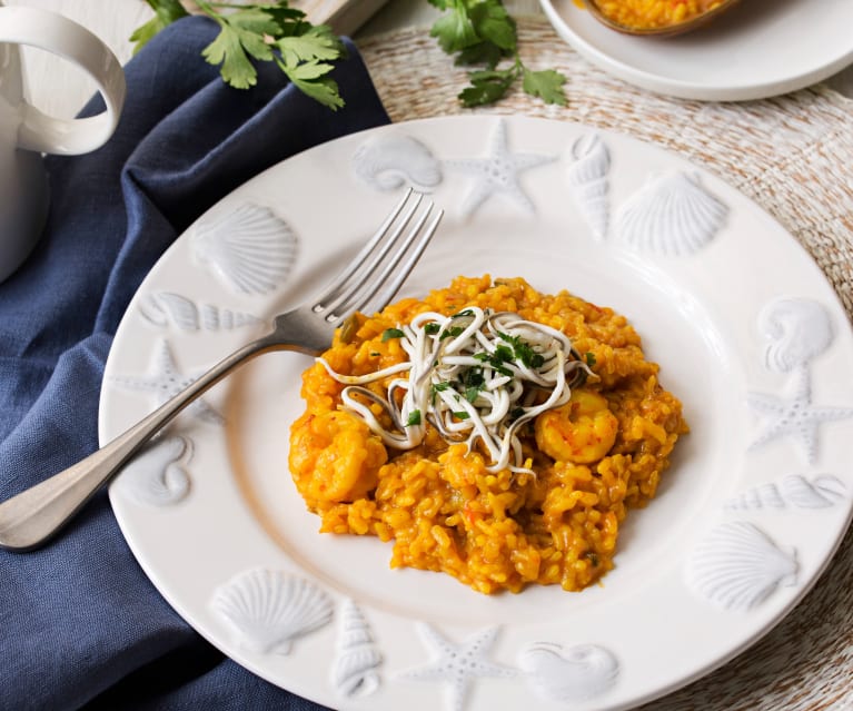 Ponga en el vaso el ajo y pique 2 seg/vel 7. Añada la cebolla, el pimiento rojo, el pimiento verde y el aceite. Trocee 4 seg/vel 4 y sofría 8 min/120°C/giro a la izquierda/vel cuchara. Incorpore los gambones y rehogue 3 min/120°C/giro a la izquierda/vel cuchara. Agregue el arroz, el caldo, el pimentón, la sal y el colorante. Sitúe el recipiente Varoma en su posición con las gulas. Tape el Varoma y programe 15 min/Varoma/giro a la izquierda/vel cuchara. Retire el Varoma y reserve. Vierta el arroz en una fuente y deje reposar durante 5 minutos. Sirva el arroz coronado con la gulas regadas con un chorrito de aceite de oliva y espolvoreado con perejil picado.