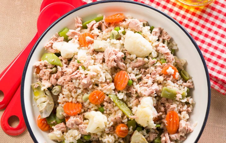 Ponga el arroz y la verdura en una fuente y añada el atún, la sal, el aceite y el zumo de limón. Mezcle con la espátula y sirva.
