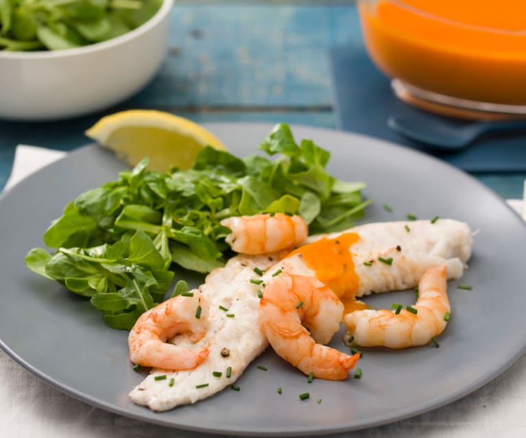 Ponga en el vaso la cebolla, los pimientos, los ajos y el aceite. Trocee 3 seg/vel 5 y sofría 10 min/100°C/vel 1. Mientras tanto, engrase el recipiente y la bandeja Varoma, reparta los lomos de pescadilla salpimentados y con un chorrito de limón. Tape y reserve. Añada el yogur, la cayena y la pastilla de caldo de pescado y triture 1 min/vel 10. Sitúe el Varoma en su posición y programe 10 min/Varoma/vel 2. Levante la tapa del Varoma y reparta los langostinos. Tape el Varoma y programe 2 min/Varoma/vel 4. Retire el Varoma. Coloque los lomos de pescadilla y los langostinos en los platos, riegue con un poco de salsa del vaso y decore con cebollino. Sirva inmediatamente acompañado del resto de salsa en una salsera.