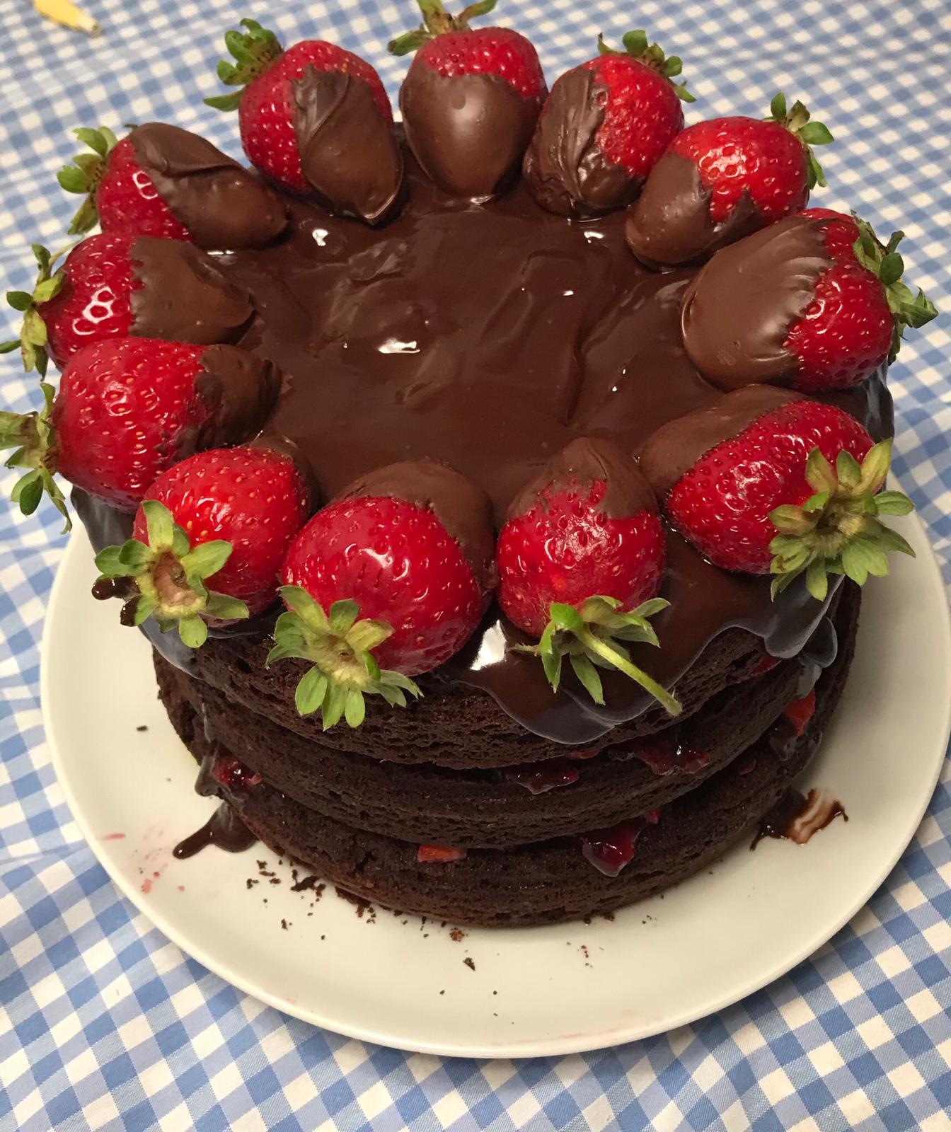 Ponga uno de los bizcochos en un plato llano para servir y extienda encima la mitad del relleno de chocolate. Coloque encima otro bizcocho y extienda el relleno de chocolate restante. Ponga el tercer bizcocho y cúbralo con la ganache de chocolate. Decore con las fresas bañadas en chocolate y sirva cortada en porciones.