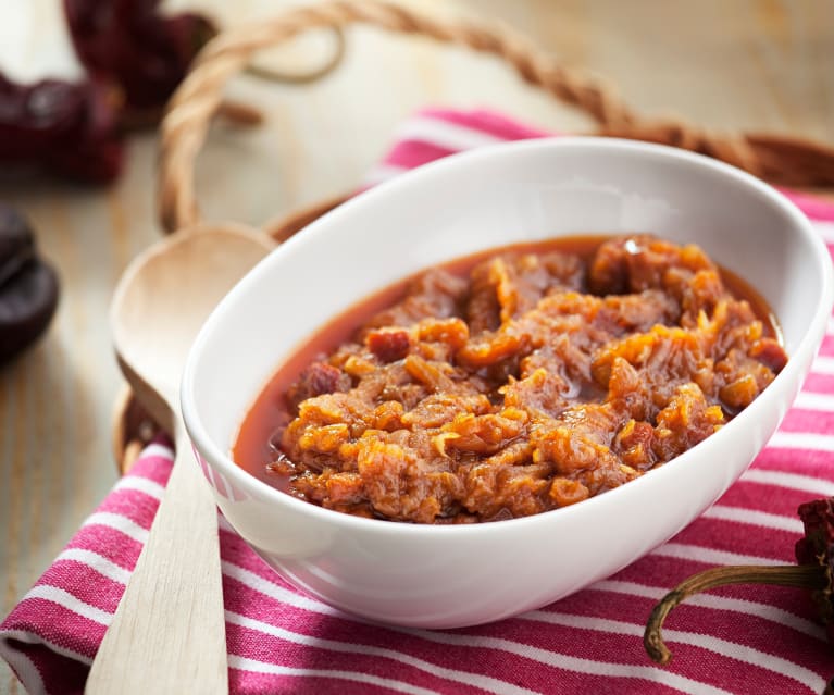 Ponga en el vaso la cebolla, la cebolla roja, los ajos, el jamón serrano y el aceite y trocee 3 seg/vel 5. A continuación, sofría 15 min/120°C/vel 1. Agregue la pulpa de pimiento y la cayena y sofría 5 min/120°C/vel 1. Añada el agua y programe 14 min/Varoma/vel 1. Vierta en una salsera y sirva inmediatamente o conserve en un tarro hermético en el frigorífico.