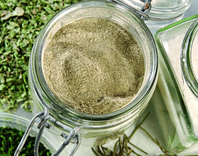 Pon las hierbas y la sal en el vaso y pulveriza 30-40 seg/vel. 9. Conserva en un tarro bien cerrado en un lugar seco.