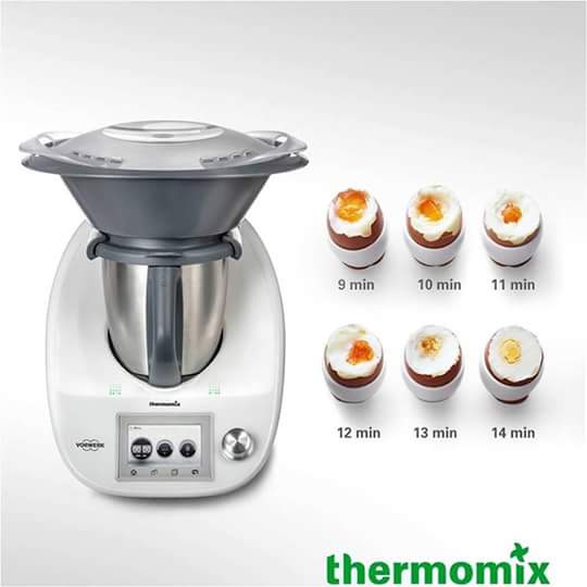 Pon en el vaso 400g de agua e introduce el cestillo con hasta 6 huevos, y programa el tiempo segun tu gusto Varoma/vel1.