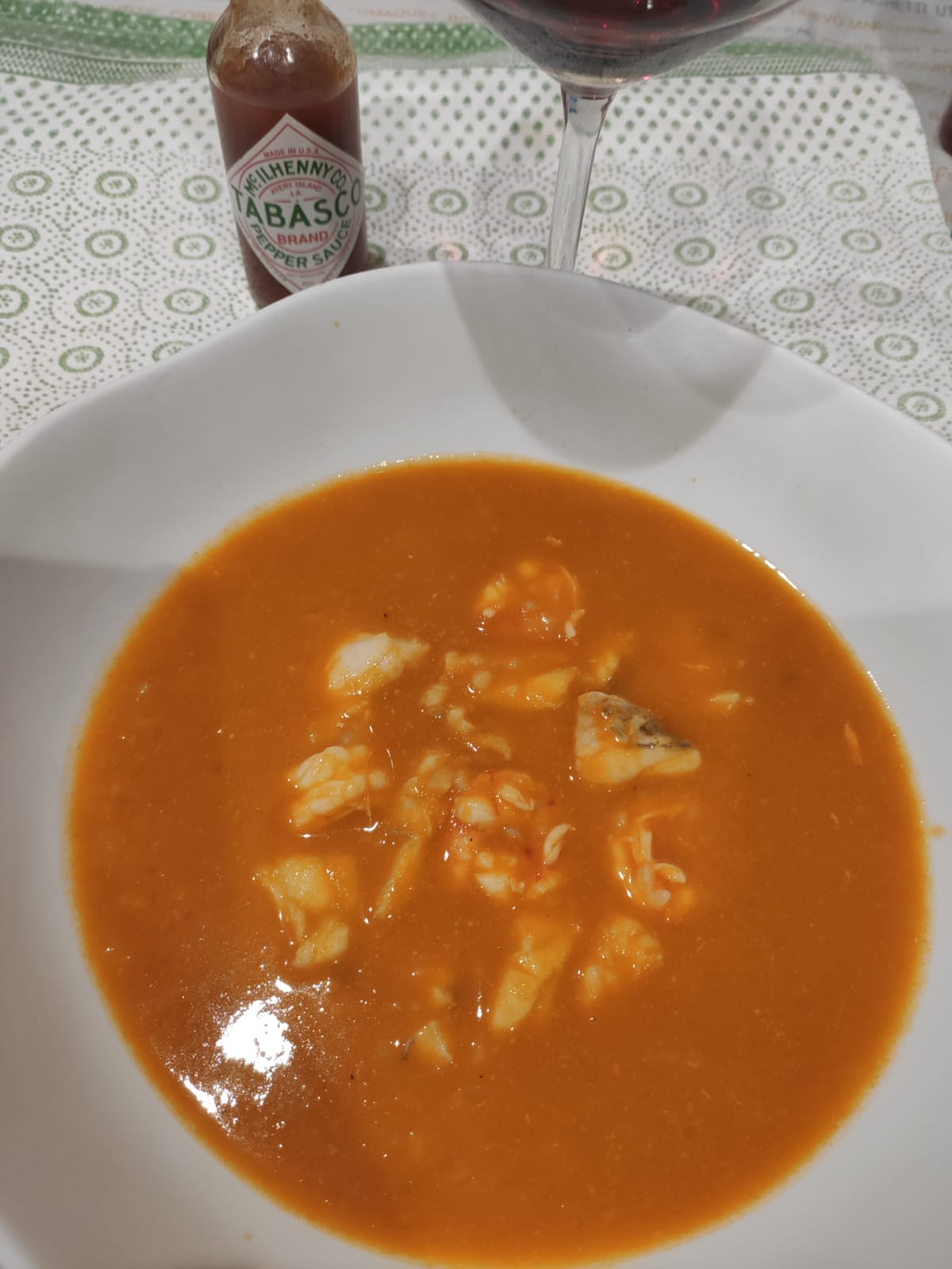 Añada las gambas, el rape y el tabasco y programe 1 min/100°C/giro invertido/vel cuchara. Vierta en una sopera y sirva bien caliente.