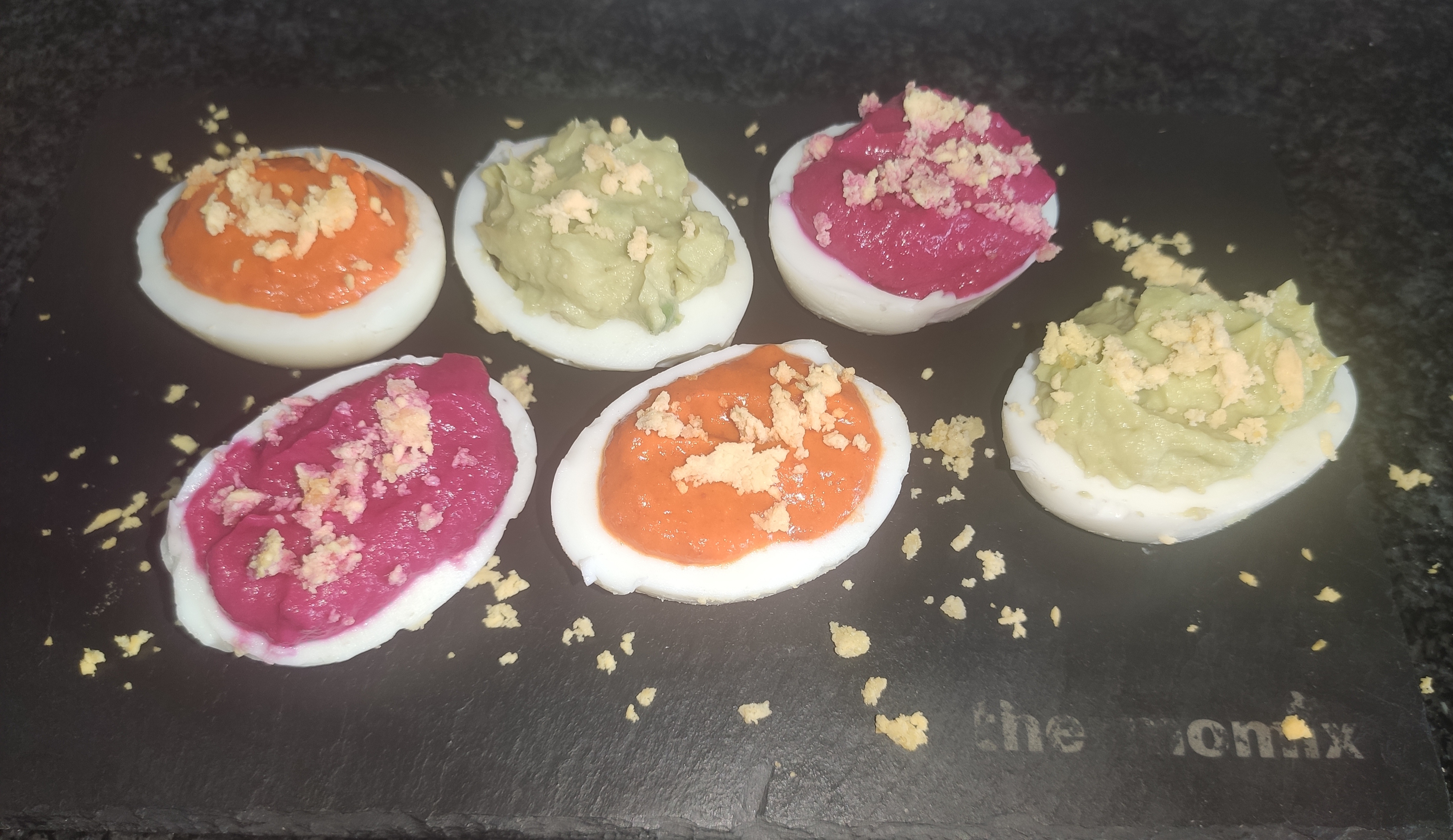 Huevos rellenos de hummus tricolor de aguacate, pimiento rojo y remolacha