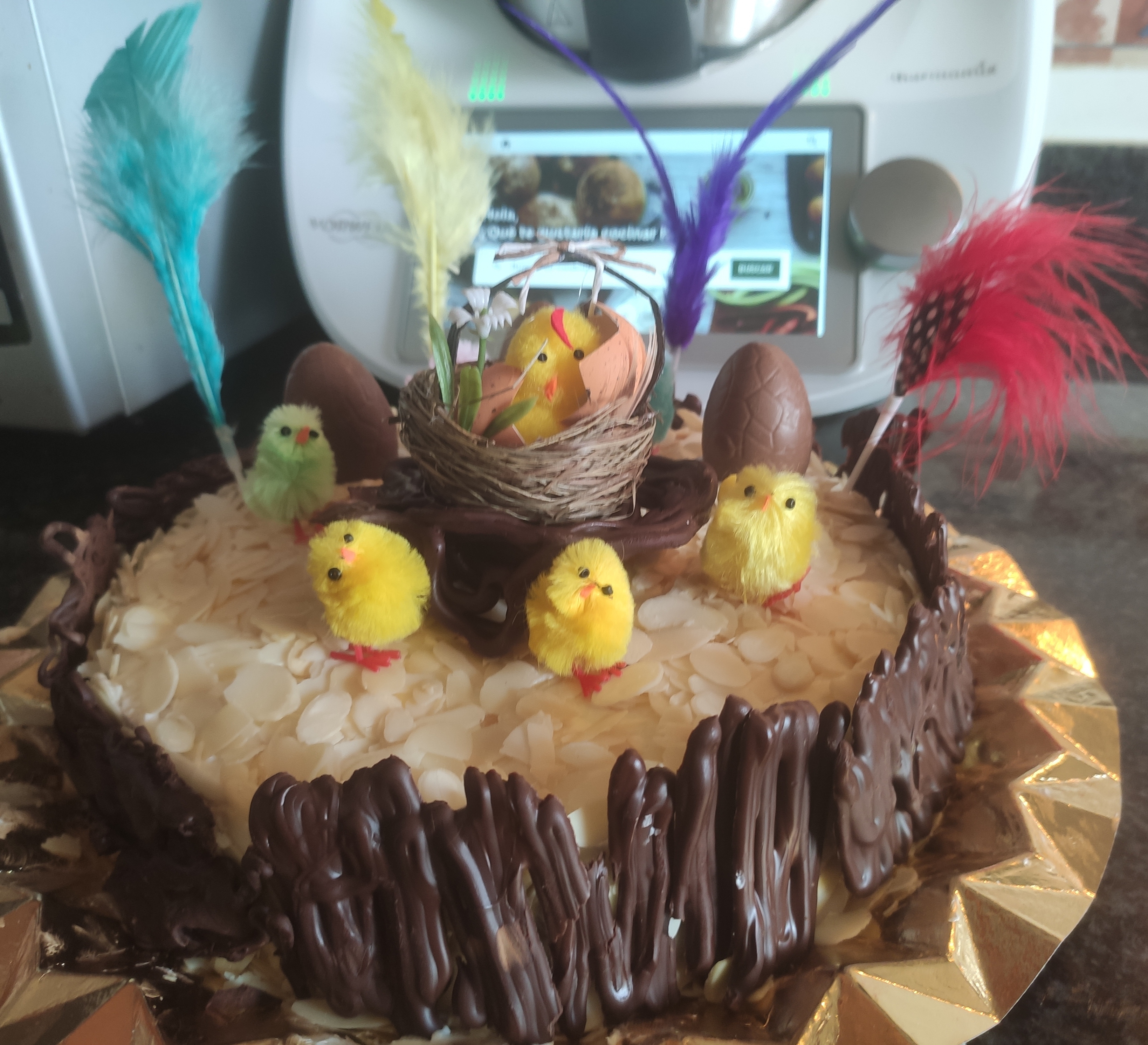 7- Para Montar nuestra mona, primero cortaremos el bizcocho en dos partes horizontalmente, rellenaremos cada capa, la del medio y la de arriba , al igual que los laterales de toda la tarta con la crema de mantequilla, con la mano iremos poniendo la almendra laminada por los laterales y superficie de la tarta, si queréis podéis cubrir sólo los laterales, eso depende del gusto de cada uno, y por último adornaremos nuestra tarta con los huevos de chocolate, plumas de colores, pollitos o figuritas.