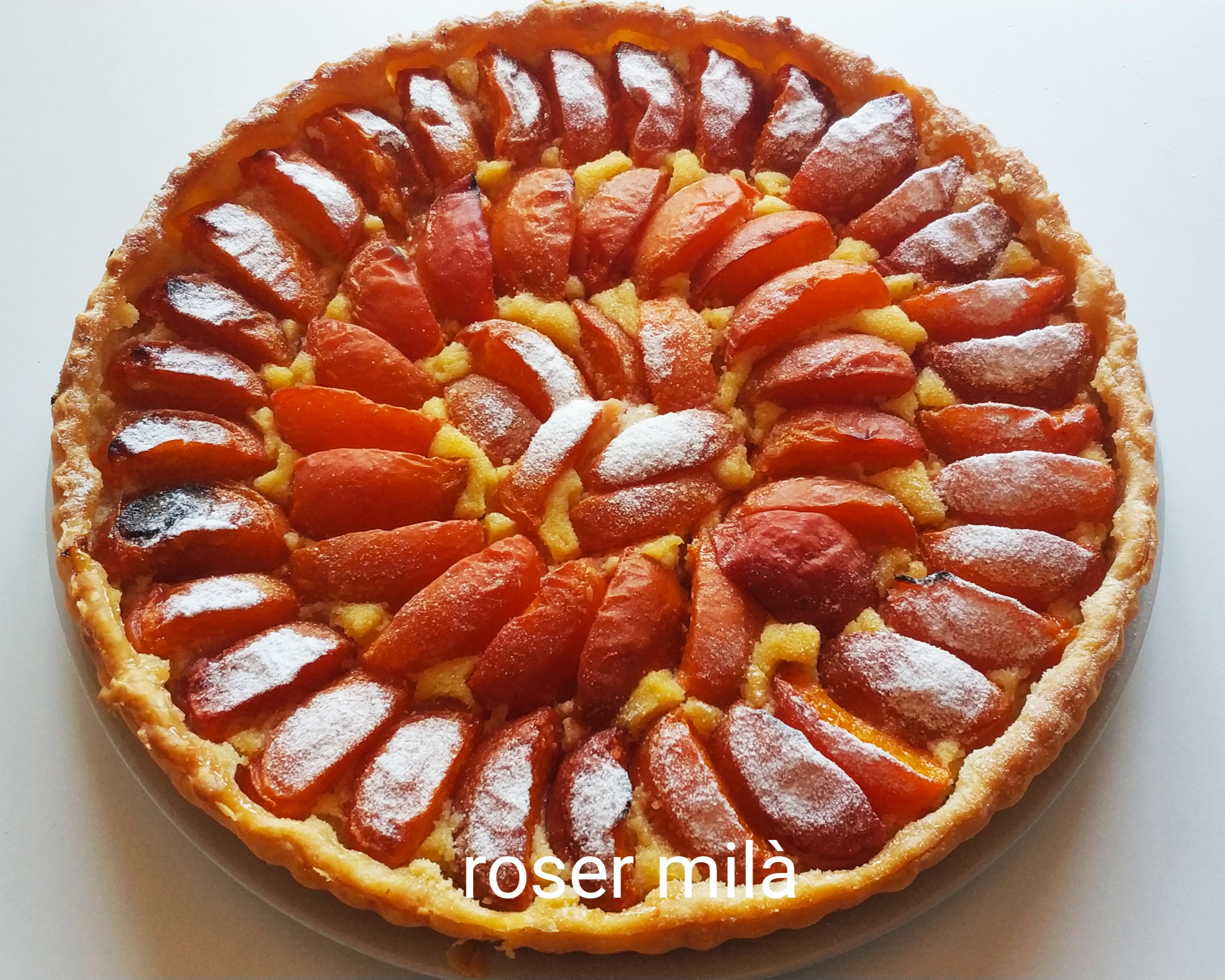 Posar tots els ingredients del farcit excepte els albercocs, al got de la Thermomix, prog vel. 6 uns segons, fins a aconseguir una barreja homogènia, abocar sobre la massa i repartir-ho el més uniforme possible. Tot seguit cobri-ho amb els albercocs sense pinyol tallats per la meitat, a quarts. Posar-ho al forn calent a 170ºC durant uns 30 min. El temps i la temperatura és orientatiu, ja que cada forn és diferent.