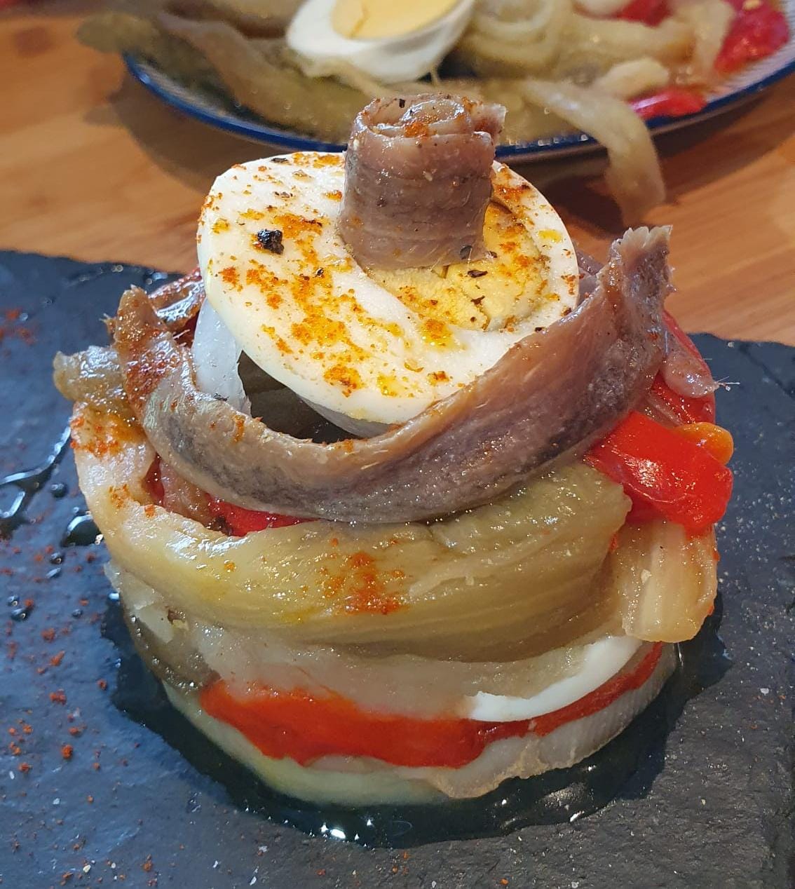 3. Empolvoreja les patates amb sal i, amb ajuda d'un cèrcol d'emplatar (Ø 8-10 cm), ves col·locant capes de patata, pebrot, albergínia i ceba. Acaba amb rodanxes d'ou dur i 1-2 filets d'anxova. Rega amb el líquid de les verdures i l'oli restant i serveix.