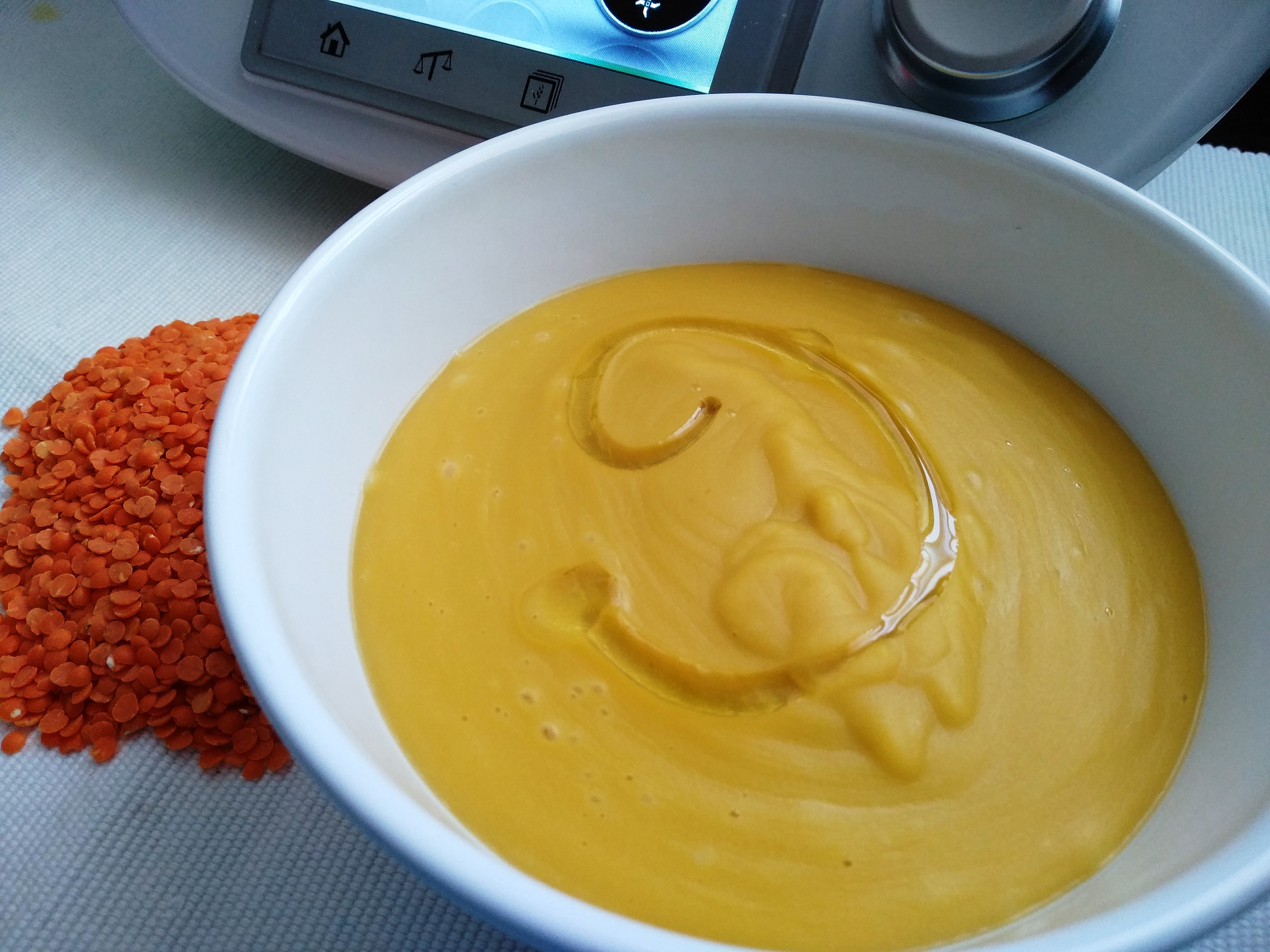 - Añadir el agua, las lentejas lavadas, el alga, las especies y cocinar 20 min / 100 grados / vel cuchara. Triturar 1 min / vel progresiva 5-10.