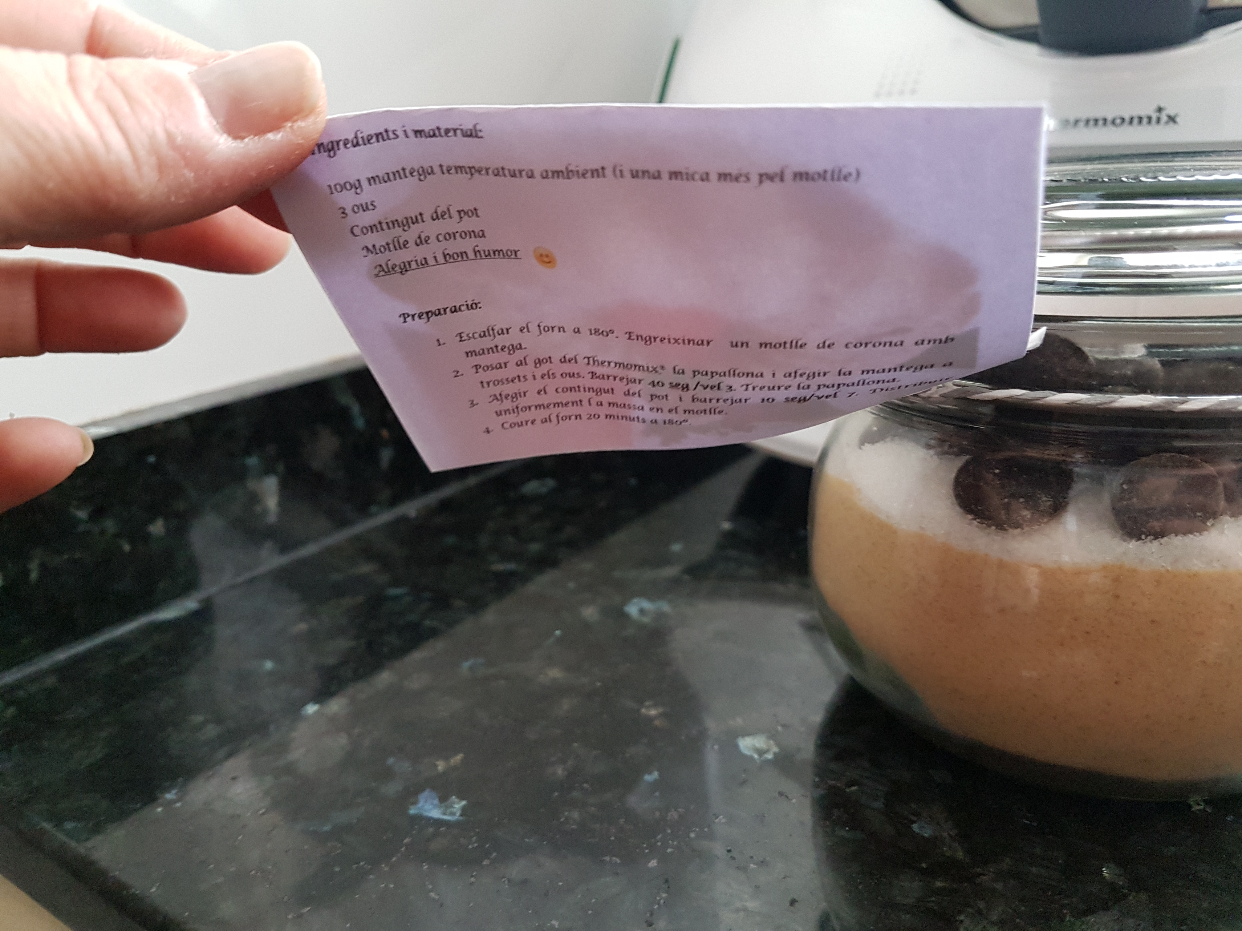 Se trata de explicar cómo usar el contenido del tarro para obtener la receta final. En este caso era sencillo... un par de instrucciones con Thermomix, añadir el contenido, remover con Thermomix... y hornear.