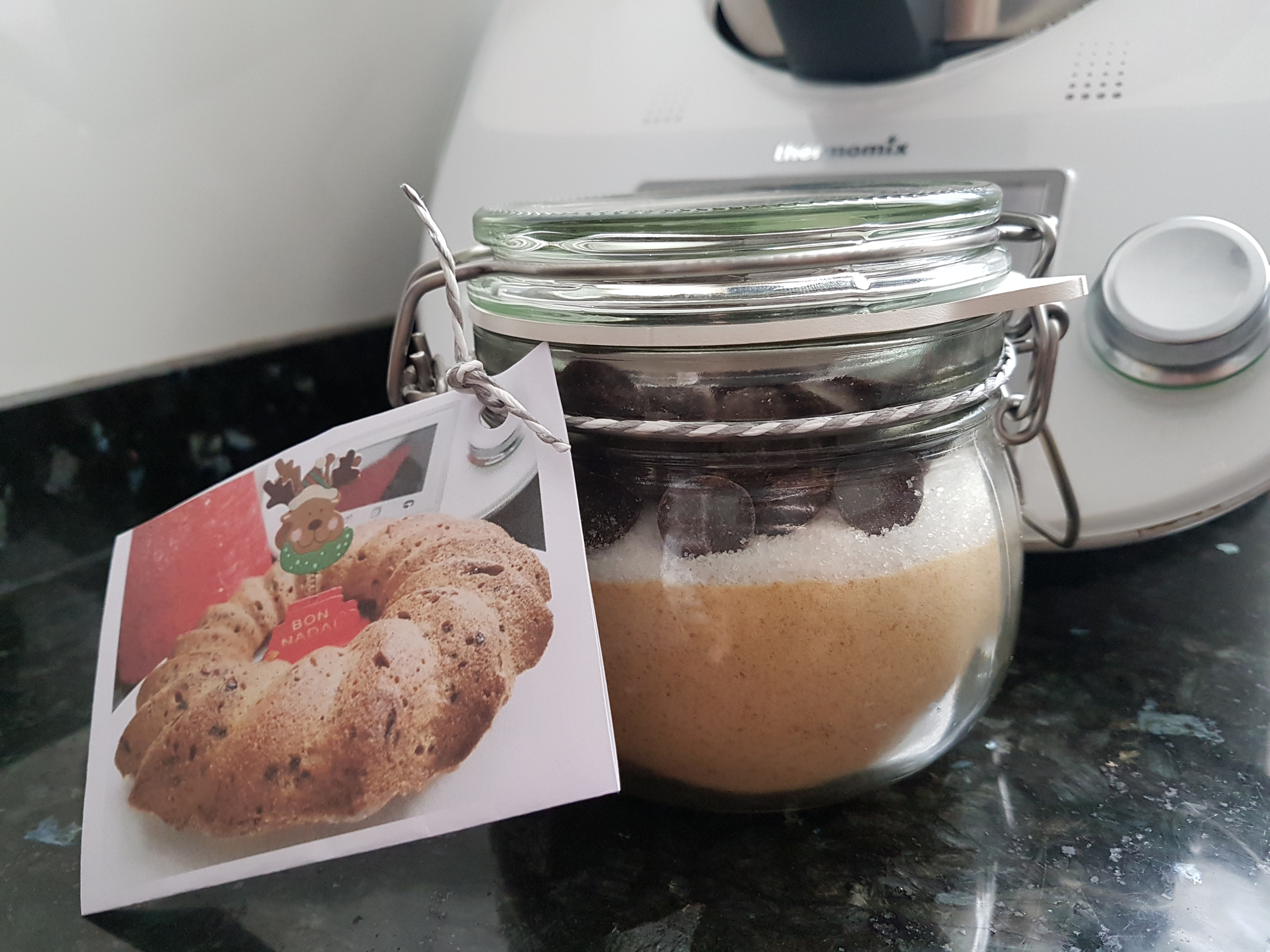 Se trata de ir pesando los ingredientes secos de la receta con nuestro Thermomix (https://www.youtube.com/watch?v=fUecShv6VGU pesar con Thermomix) e ir poniéndolos por capas. Es importante presionar bien cada capa antes de poner la siguiente (yo lo he hecho con el pie de una copa de vino) y llenar bien el tarro con los ingredientes, hasta el límite, para evitar que una vez cerrado se muevan las capas