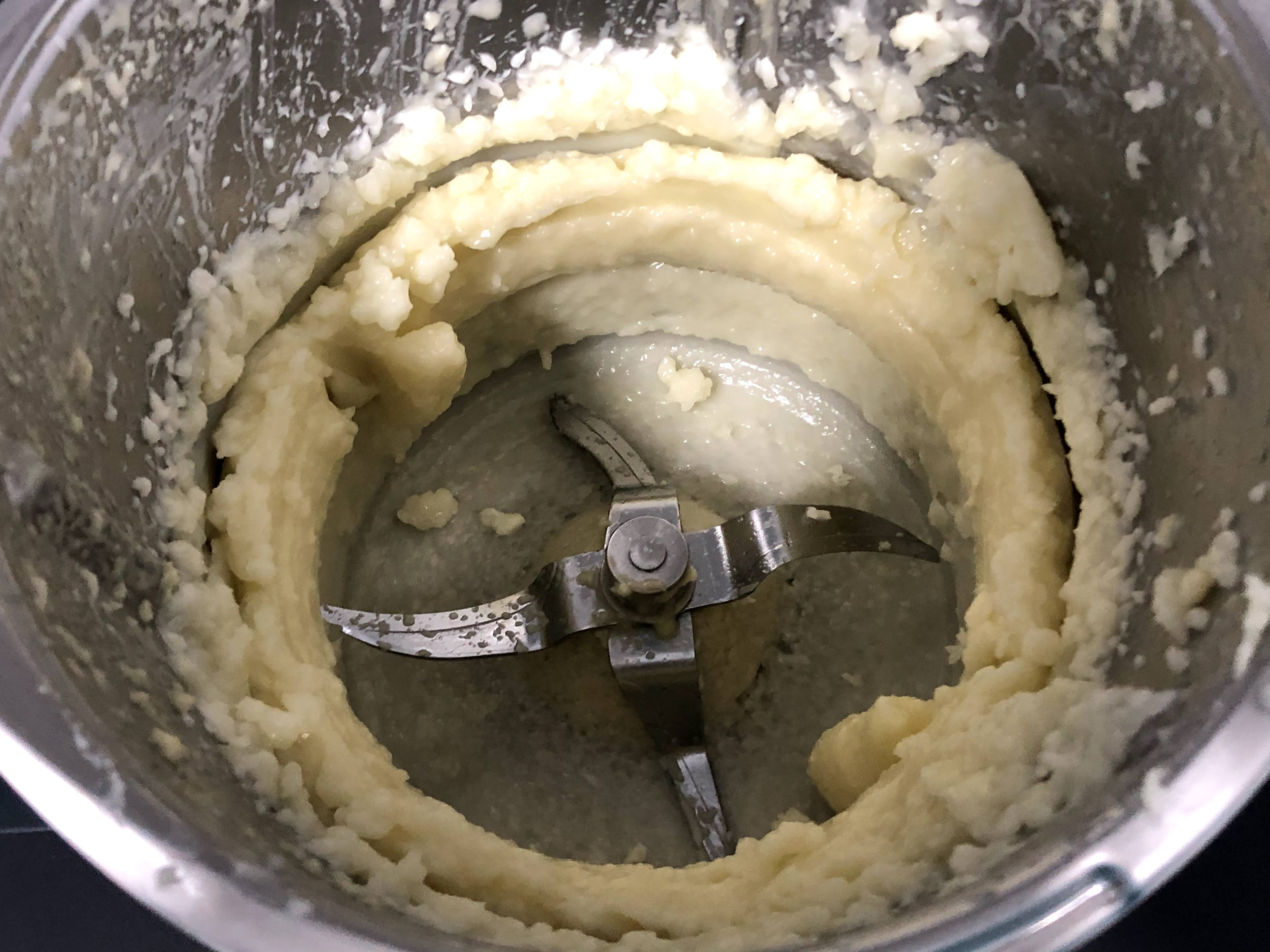 Ponga en el vaso las patatas cocidas, el aceite y la sal y triture 3 seg/vel 4. Retire a un bol y deje enfriar completamente (aprox. 1 hora). Mientras tanto, continúe con la receta. Lave y seque el vaso.