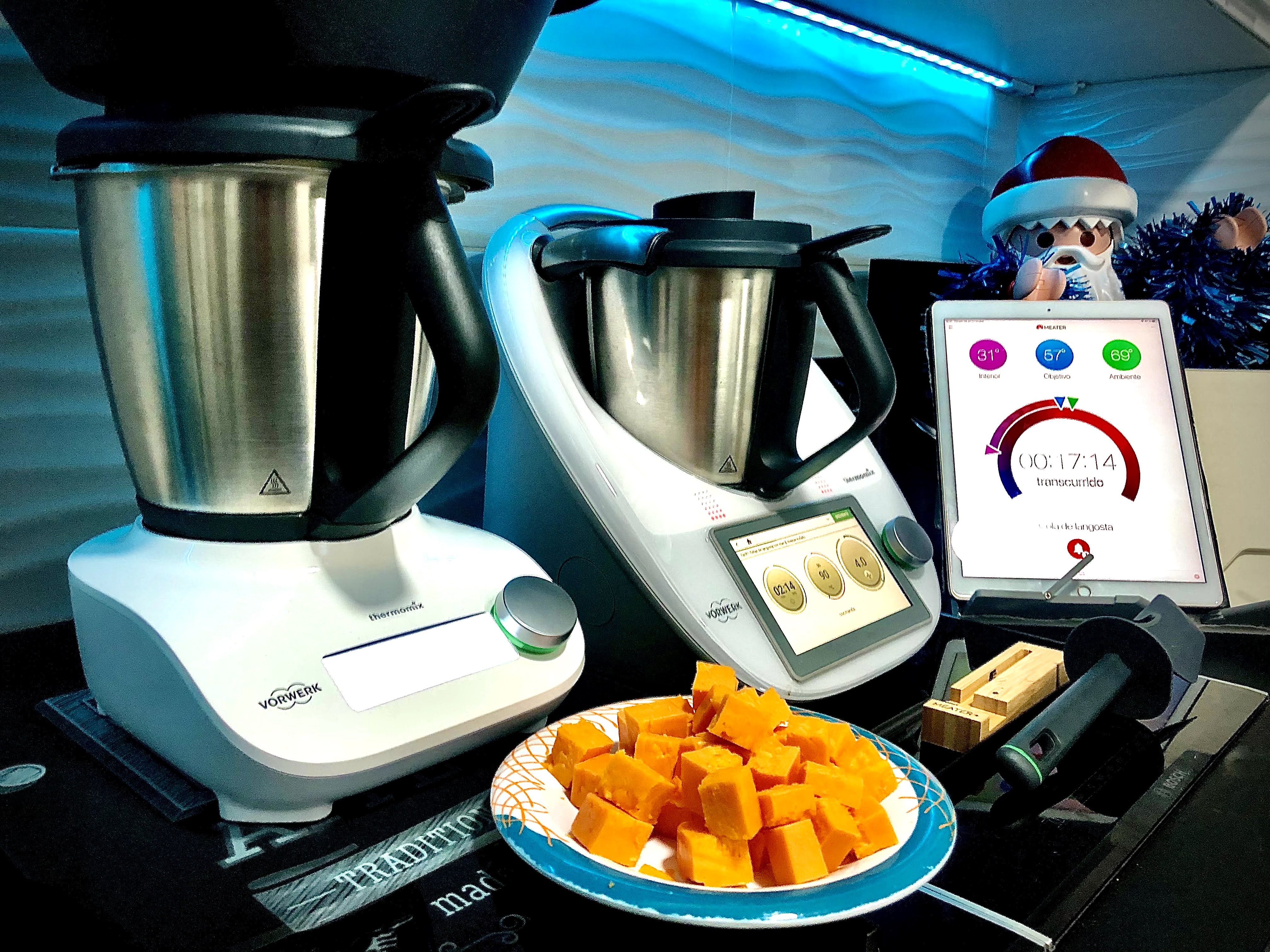 Tape el Varoma, seleccione ‘Iniciar cocción’ en la app de MEATER® y cocine 25 min/Varoma/vel 2. En caso de que las colas de langosta necesiten más tiempo de cocción, programe el tiempo indicado en la app de MEATER®/100°C/vel 4.