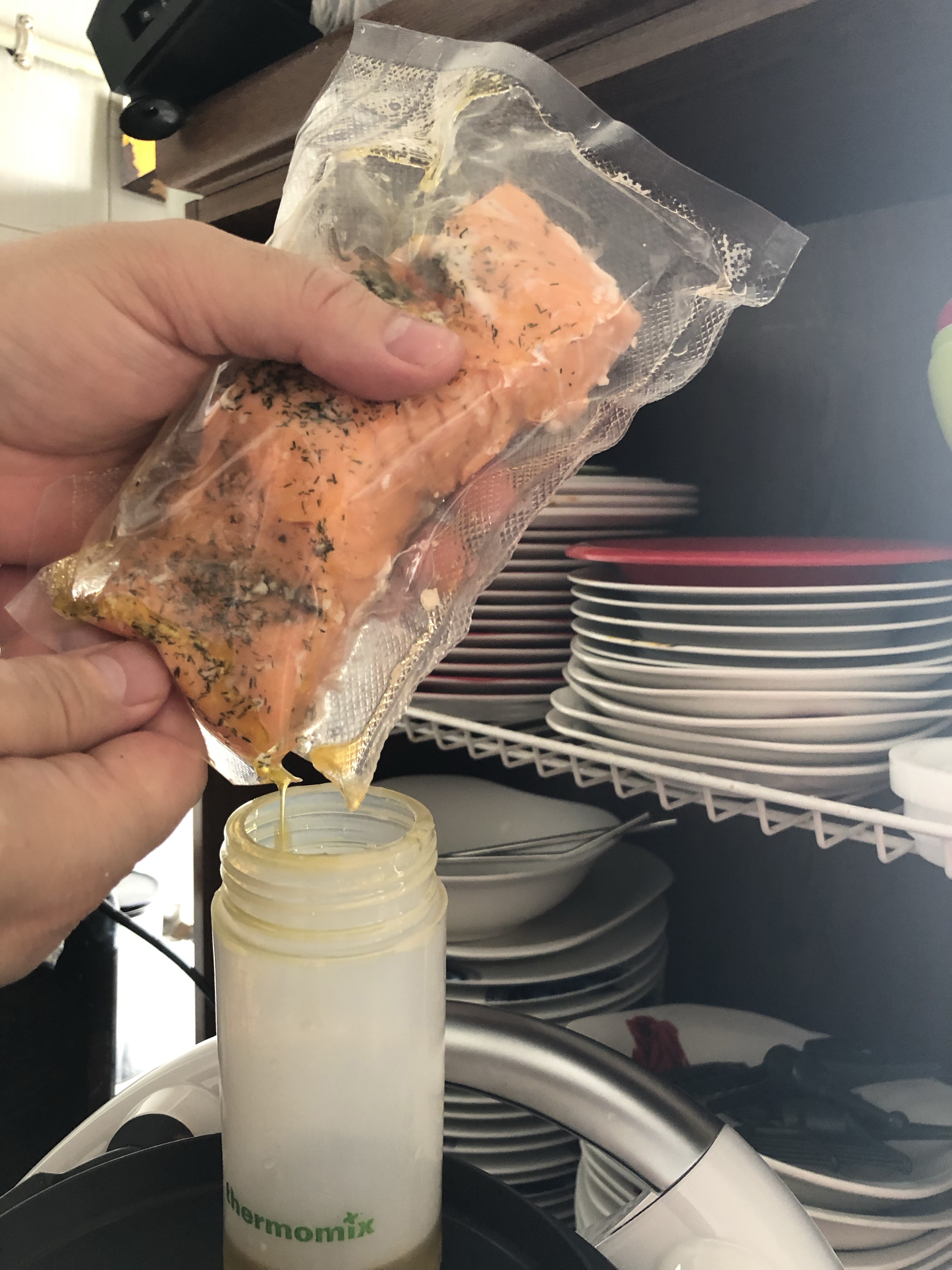 Transcurrido el tiempo, extraemos los paquetes de salmón y los abriremos para extraer los jugos y el aceite del interior para proceder a realizar el Mayonesa Higienizada de Salmón.