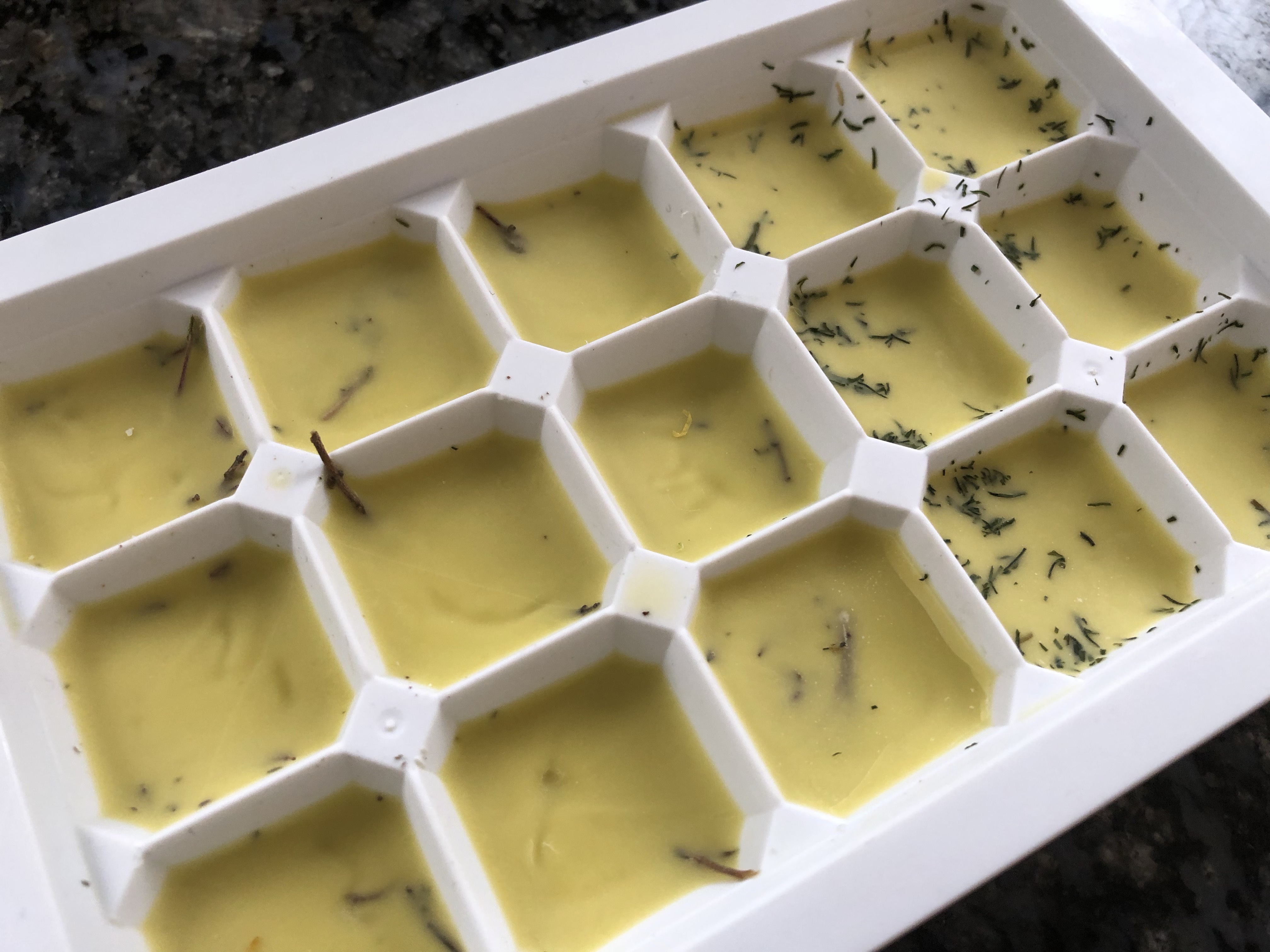 Primero haremos nuestro cubitos de aceite y eneldo. En una cubitera rellenaremos los espacios de aceite y eneldo al gusto. En mi caso aproveche para hacerlos también de tomillo.